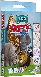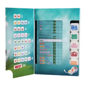 Airport Yatzy bevat: vijf kleurrijke dobbelstenen met voorwerpen van het vliegveld, een scoreblok met 200 spelformulieren en uitgebreide instructies.