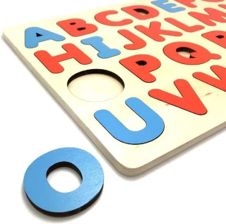 De houten Alfabet Puzzel Montessori kenmerkt zich door zijn duidelijke concept: Blauwe klinkers, rode medeklinkers, duidelijk lettertype.