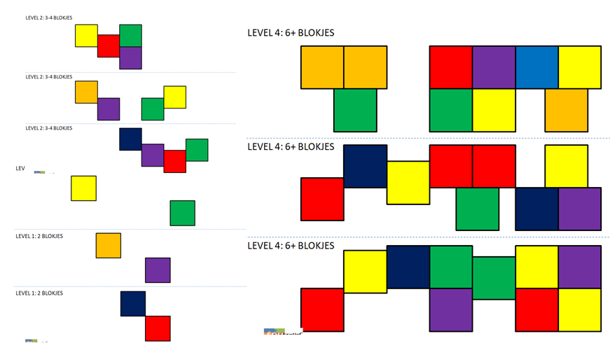 Print de kaarten uit. Knip de verschillende patroonkaarten op de stippellijnvan elkaar en lamineer ze. Begin met de kaarten op level 1 en bouw langzaam op. Het is de bedoeling dat de blokjes op dezelfde positie worden neergelegd als op de kaart staat aangegeven. Bij level 1 en 2 geef je het exacte aantal blokken bij level 3 en 4 geef je wat extra blokken om de moeilijkheidsgraad te vergroten.