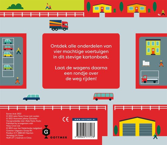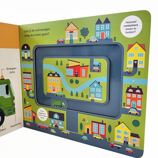 In het dikke kartonboek Een Rondje Met De Vrachtwagen maak je eerst kennis met machtige voertuigen die je zomaar tegen kunt komen op straat. Daarna kun je het zelf een rondje laten rijden! Met je vinger kan je vrachtwagen, autotransporter, monstertruck en de vuilniswagen door de hele stad of over het parcours sturen.