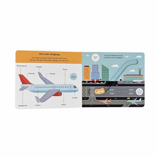 In het dikke kartonboek Een Rondje Met Het Vliegtuig maak je eerst kennis allemaal voertuigen die boven je hoofd in de lucht vliegen. Daarna kun je de voertuigen zelf laten vliegen. Met je vinger kun je het vliegtuig, de heteluchtballon, de helikopter en het ruimteschip de lucht insturen!