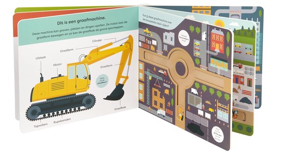 In het dikke kartonboek Een Rondje Over De Bouwplaats maak je eerst kennis met een groot voertuig dat gebruikt wordt in de bouw. Daarna kun je het zelf een rondje laten rijden! Met je vinger kan je de bulldozer, graafmachine, kiepwagen en shovel over de hele bouwplaats sturen.
