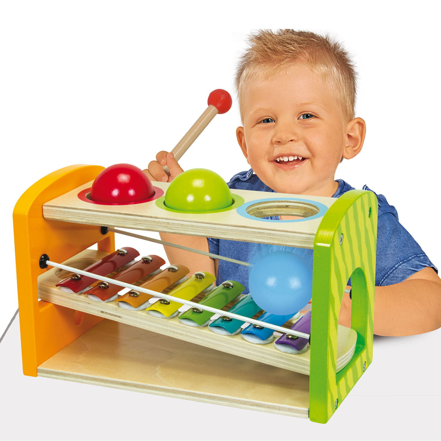 Met de Eichhorn houten hamerbank met xylofoon heb je 3 activiteiten in 1. Hamer de ballen door de openingen en zie hoe ze naar beneden vallen en rollen over de ballenbaan. Ben je uitgespeeld? Draai dan het plankje van de ballenbaan om en je hebt een xylofoon waarmee je de mooiste klanken laat horen. De hamerbank stimuleert de motoriek en maakt kinderen bewust van oorzaak-gevolgrelaties. De xylofoon zorgt voor creativiteit in het maken van muziek.