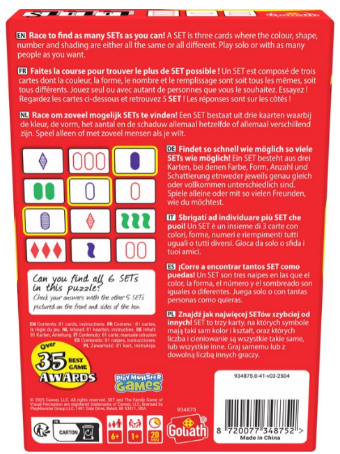 Kaartspel SET is een bekroond en uitdagend kaartspel, waarin je moet racen om zoveel mogelijk SET’s te vinden! Dit spel test je visuele scherpzinnigheid en snelheid, en is ideaal voor zowel jong als oud. Een SET bestaat uit drie kaarten waarbij elk individueel kenmerk (kleur, vorm, getal en schaduw) ofwel allemaal hetzelfde is, ofwel allemaal anders. Zodra je een SET ziet, roep je “SET!” en pak je de kaarten. De speler die de meeste SET’s verzamelt, wint het spel.
