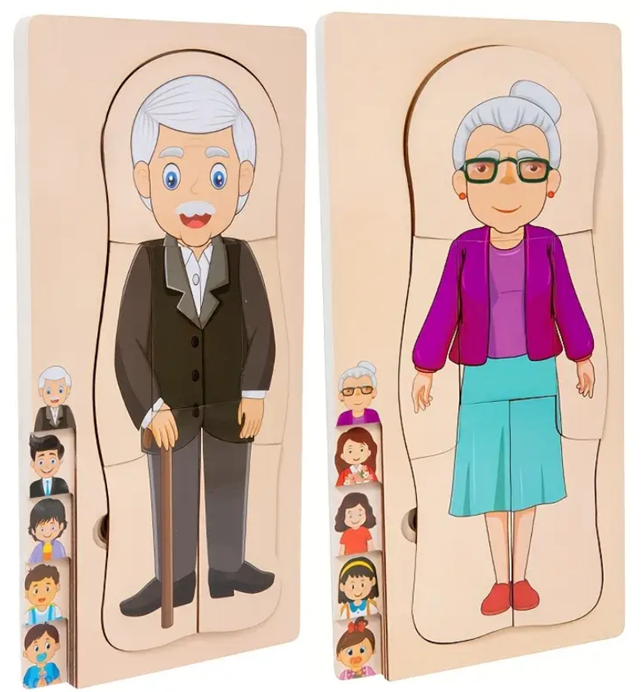 Met deze lagenpuzzel leeftijd krijg je inzicht hoe een mens steeds ouder wordt! De lagenpuzzel bestaat uit vijf lagen. Je begint als peuter en vervolgens puzzel je de levensfasen van kleuter, tiener, volwassene en bejaarde in elkaar! De peuter is de basis. Vervolgens bestaat iedere laag uit zes puzzelstukken.