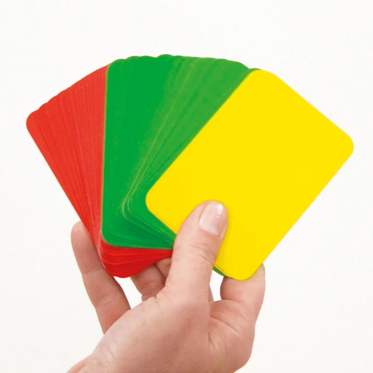 Deze stoplichtkaarten zijn ideaal te gebruiken bij het bespreken van stellingen in een grotere groep. Deelnemers kunnen antwoorden op een stelling met een rode kaart (oneens), geel (neutraal) of groen (eens).
