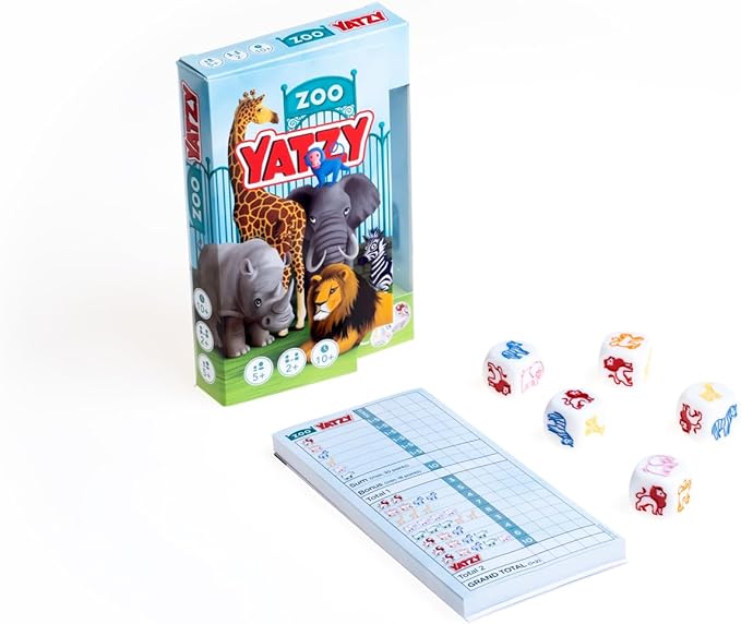 Zoo Yatzy bevat: vijf kleurrijke dierendobbelstenen, een scoreblok met 200 spelformulieren en uitgebreide instructies.