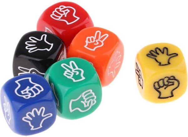 Leuke kleurrijke Dobbelstenen Steen Papier Schaar! De basis is de drie verschillende voorwerpen die je met de dobbelstenen kunt gooien, namelijk steen, papier of schaar. Spelers gaan beginnen door tegenover elkaar te gaan staan of te zitten. Met elk voorwerp dat gegooid wordt, heb je evenveel kans om te winnen. Maar er zijn wel een aantal basisregels! Zo wint de steen van de schaar, omdat de schaar bot wordt van een steen. Het papier wint van de steen, omdat je het papier over de steen kunt leggen. En de schaar wint uiteindelijk weer van het papier, omdat de schaar in het papier knipt.
