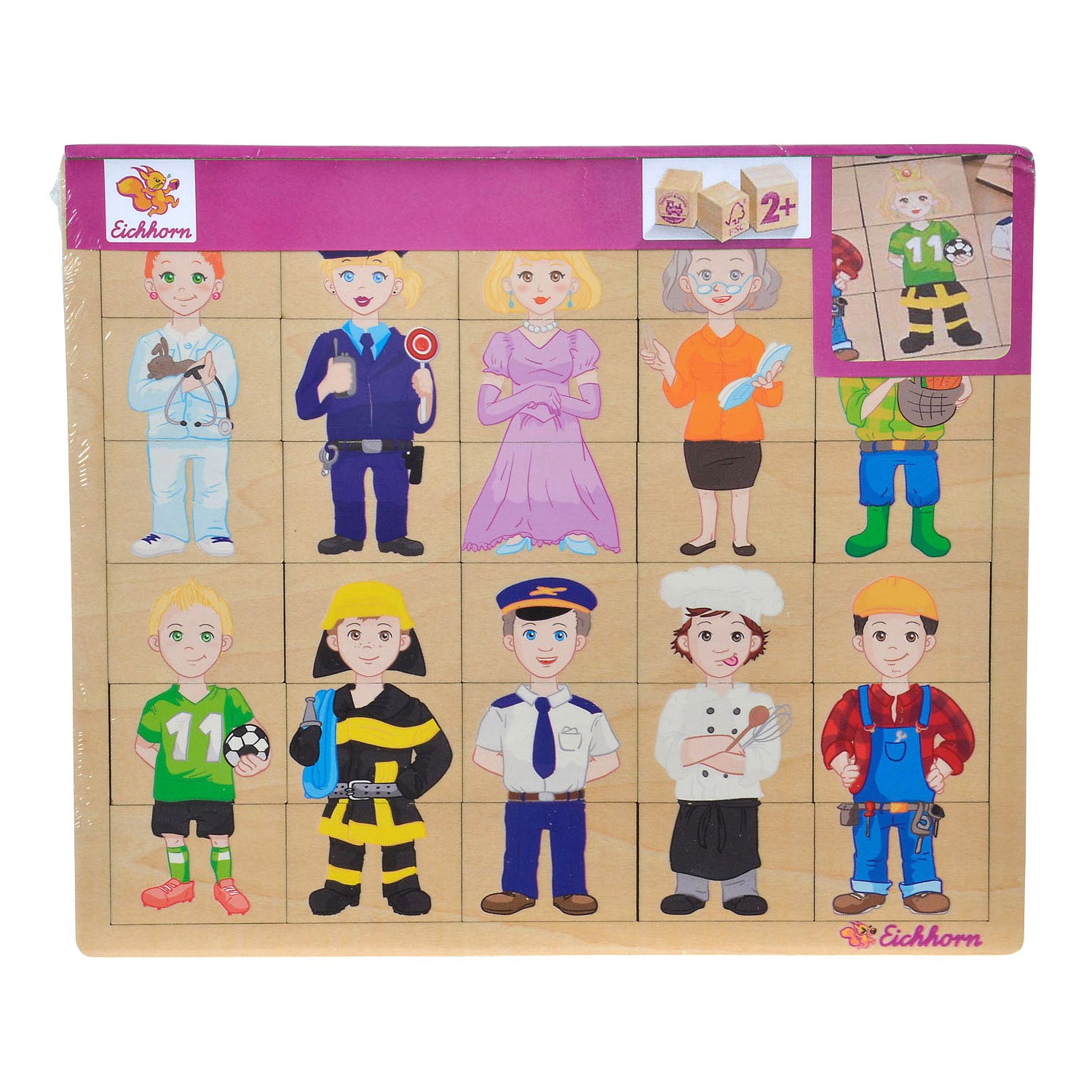 Deze Eichhorn houten beroepen puzzel bestaat uit 30 puzzelstukken en 10 mensen die een beroep uitbeelden.