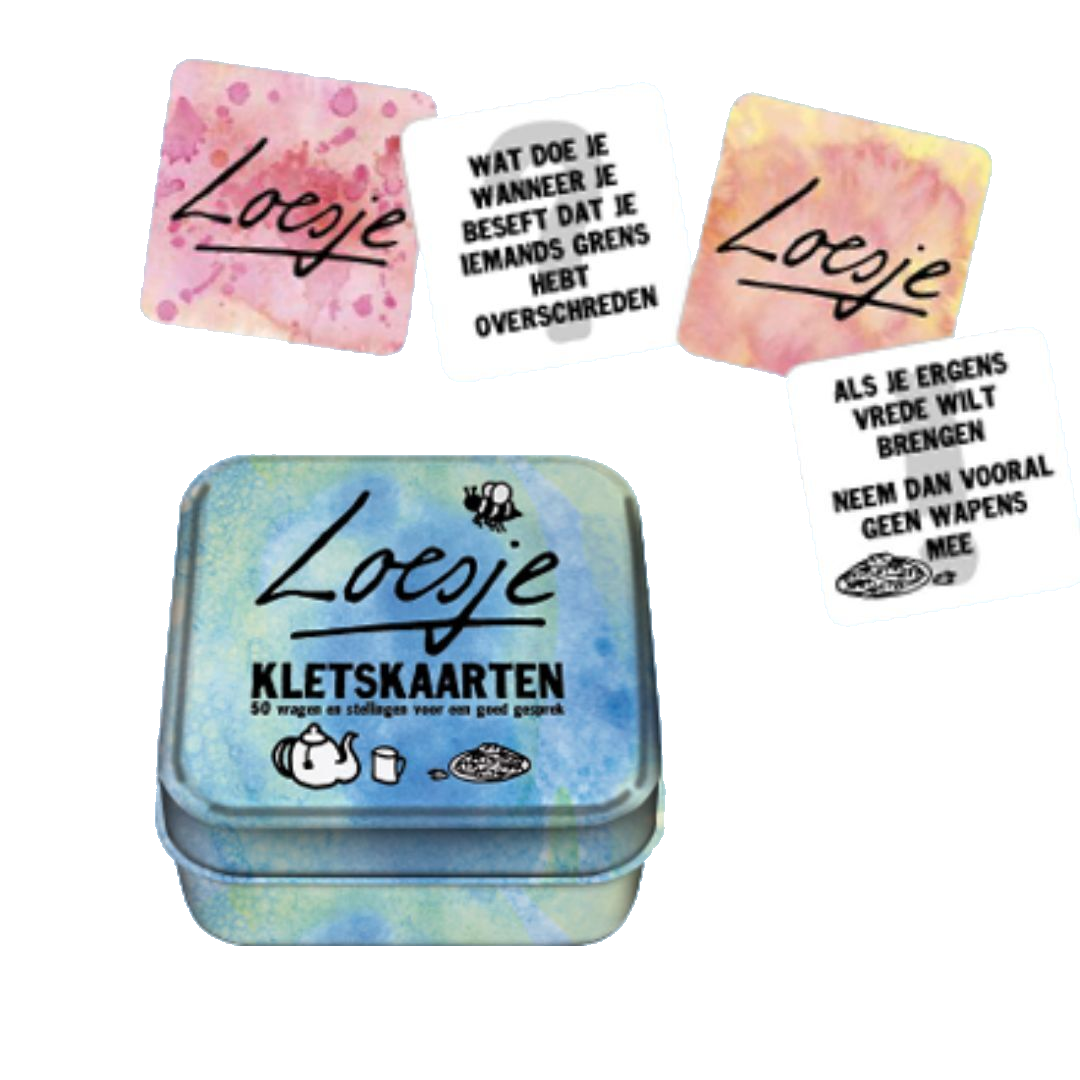 Deze Loesje Kletskaarten kunnen je helpen om goede gesprekken te voeren en zelf een mening te vormen. In dit blikje vindt je vijftig kaartjes met stellingen en vragen over persoonlijke en wereldse thema’s die tot een goed gesprek kunnen leiden. Zo kom je samen tot nieuwe ideeën en mooie inzichten. Ga met vrienden of familie in gesprek om elkaar en de thema’s beter te leren kennen.