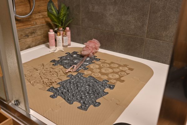 De Orthopedische Speelmat Spa is een supergaaf en spannend feestje voor je handen en je voeten. De mat bestaat uit maar liefst 8 randstukken en 4 verschillende puzzelstukken met de mooiste sensorische vormen. De mat is speciaal ontworpen voor gebruik onder de douche zodat je tijdens het douchen kunt genieten van een reflexieve voetmassage!