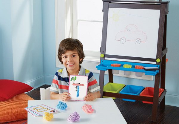 Deze set is speciaal ontworpen om vroege alfabetiseringsoefeningen te stimuleren, aangezien kinderen het schuim vormen en vormen in de letters op de activiteitenkaarten.