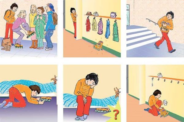 Elk beeldverhaal bestaat uit 2 delen. In het eerste deel van de serie afbeeldingen wordt telkens de beginsituatie geschilderd. Zodra de kaart met het vraagteken verschijnt, kiezen de kinderen een symboolkaart uit waarmee ze kunnen vertellen hoe ze de fout zelf weer goed zouden maken. De verschillende voorstellen worden besproken en dan met het tweede deel van het beeldverhaal vergeleken. Onderwerpen: iemand iets afpakken, stelen, iemand ten onrechte verdacht maken, iemand bang maken, iemand kwetsen of voor schut zetten, expres of per ongeluk iets kapot maken, zich niet aan de regels houden.