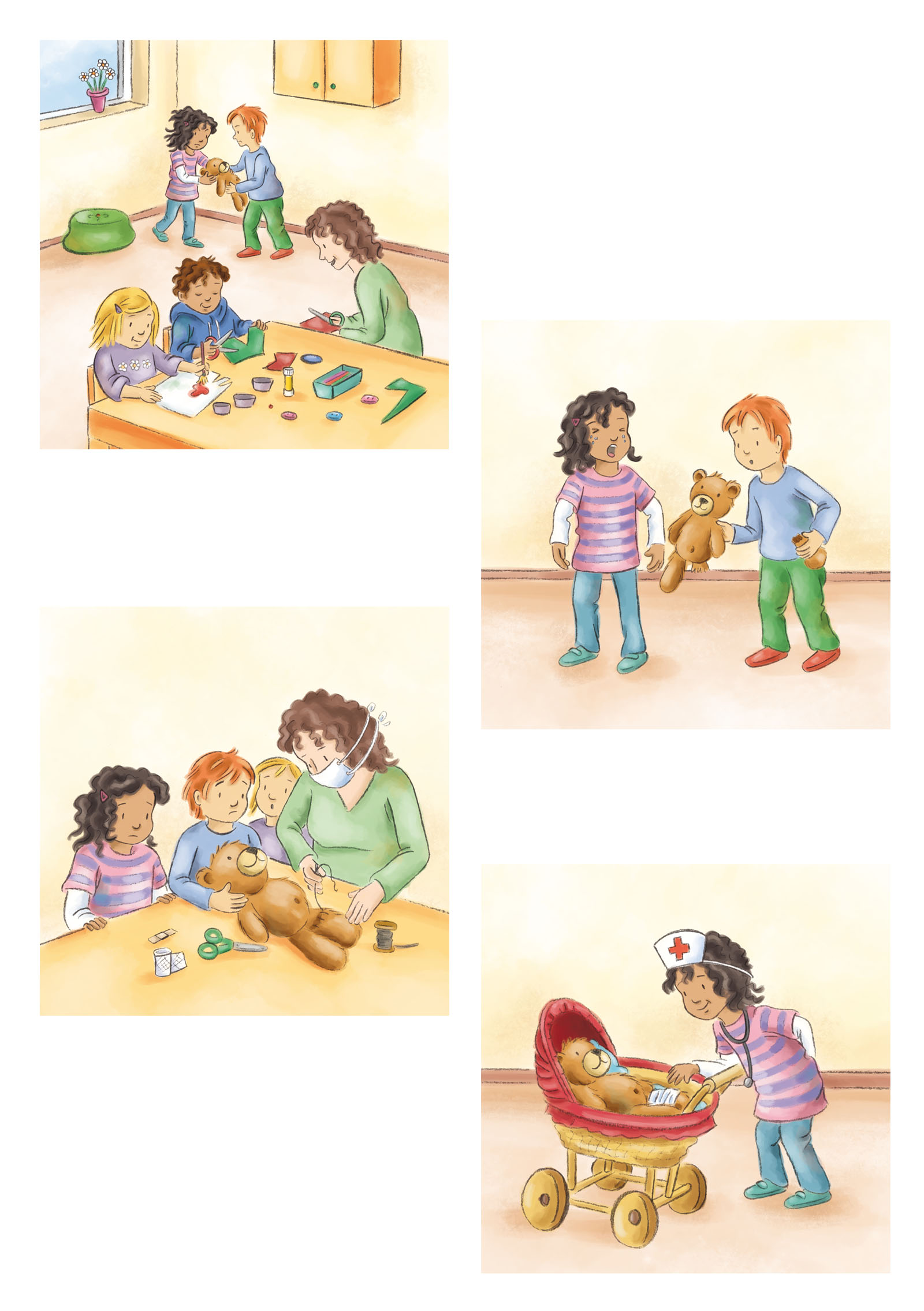 Oplettend omgaan met jezelf en anderen is voor kinderen een belangrijk thema. De eenvoudige beeldverhalen tonen alledaagse situaties die elk kind kent. Ze roeren uiteenlopende onderwerpen aan zoals • Beweging – fit zijn (sport, buitenactiviteiten) • Gezond leven (preventie, voeding, hygiëne) • Voor jezelf en anderen zorgen (gevaren vermeiden, oplettend zijn) • Ziekte, verwonding, dood • Speciale behoeften (diversiteit, integratie, handicap). De verhalen zijn bijzonder geschikt om kinderen te helpen bij het vrij spreken en vertellen, ook voor de groep, wat ook voor peuters van belang is. Maar de series afbeeldingen dienen niet alleen als onderwerp om over te praten – de uiteenlopende uitgangspunten of plaatsen waar ze spelen nodigen uit om ze preciezer te bekijken en gedifferentieerd na te vertellen. De fantasievolle verhalen stimuleren ook het uitwisselen van eigen ervaringen en bevorderen aandacht, creativiteit en waarnemingsvermogen.