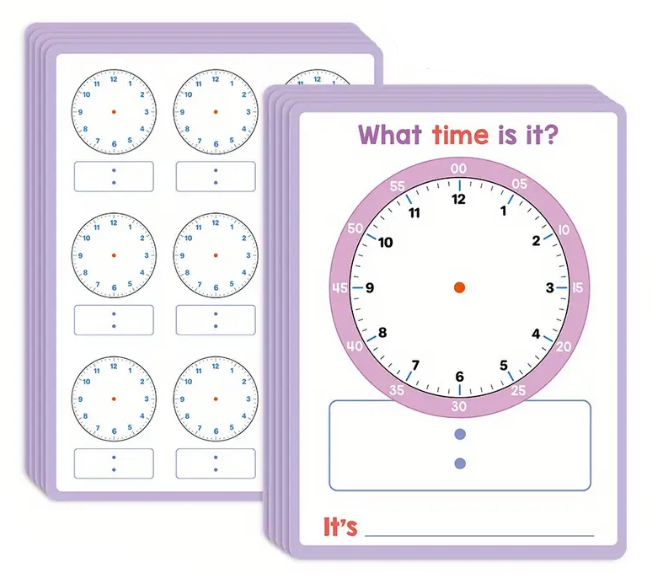 Met de Schrijfkaart Tijd kun je urenlang oefenen op het tekenen van klokken! De Schrijfkaart Tijd is een geplastificeerde kaart met aan de voorzijde een grote klok waarop je de cijfers in de klok kunt tekenen of de digitale tijd op kunt schrijven.