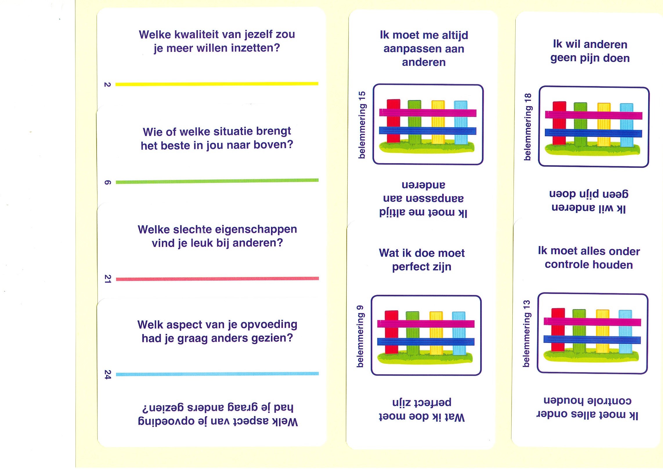 - Belemmeringen (29 stuks). Deze kaarten helpen je bij het vinden van een antwoord op de vraag: welke gedachten remmen jou om (deels) verborgen kwaliteiten in te zetten? Als je dit weet, kun je onderzoeken hoe je met deze gedachten kunt omgaan, zodat je (deels) verborgen kwaliteiten meer ruimte krijgen.