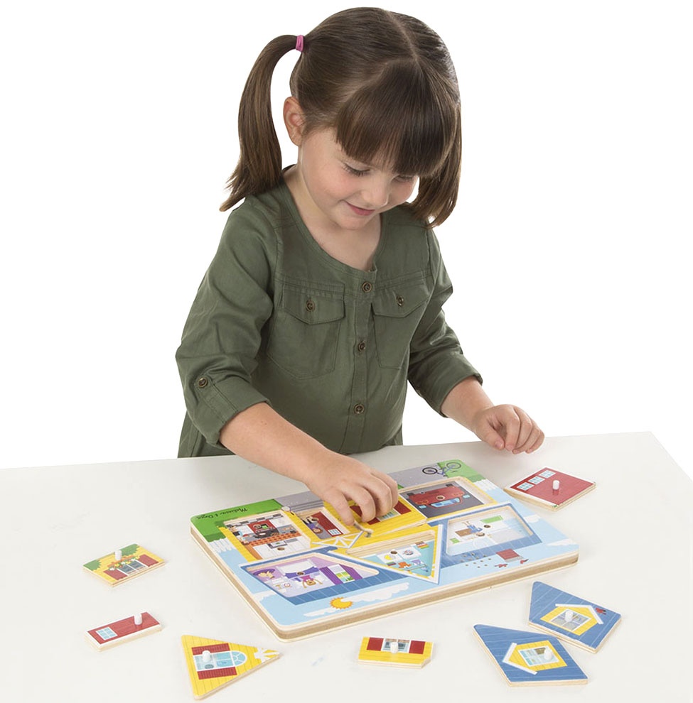 Urenlang puzzelplezier gegarandeerd met deze Vormenpuzzel Huis met geluiden van Melissa & Doug.